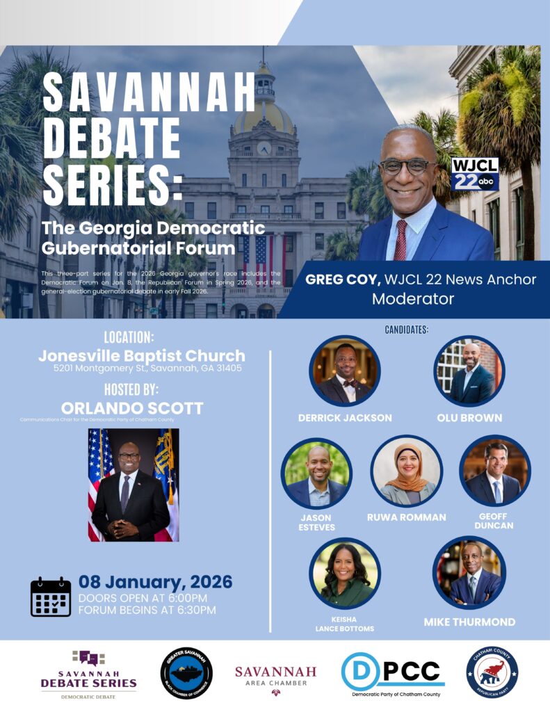 The Savannah Debate Series is a three-part civic forum initiative focused on Georgia’s 2026 gubernatorial election. The series is hosted by the Democratic Party of Chatham County, the Chatham County Republican Party, the Greater Savannah Black Chamber of Commerce, and the Savannah Area Chamber of Commerce, with each organization leading one stage of the election cycle.