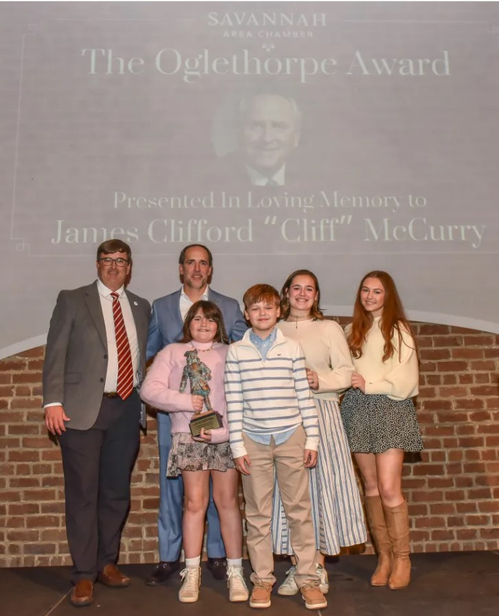 The Chamber’s highest honor, the James Oglethorpe Leadership Award, was presented posthumously to Cliff McCurry and accepted by his son, Jamie McCurry, and family. The award was also given to Don Waters, recognizing his longstanding leadership and advocacy for education in Savannah and across Georgia.