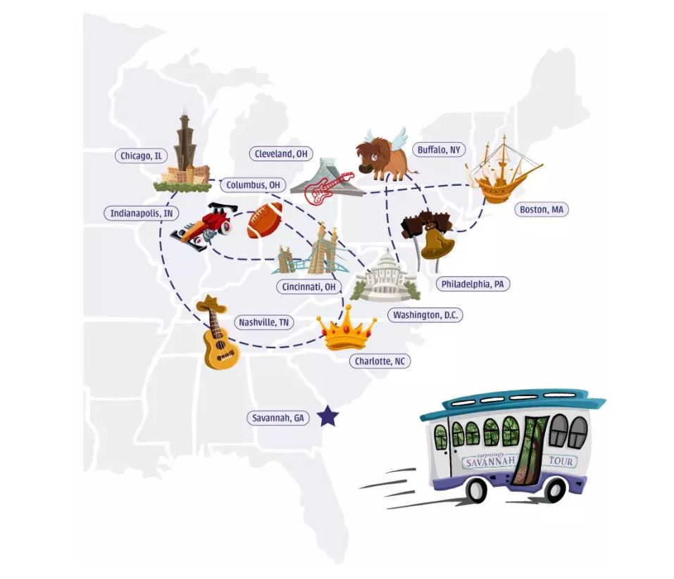 Below are the official tour stops, most of which offer non-stop flight service to/from Savannah.