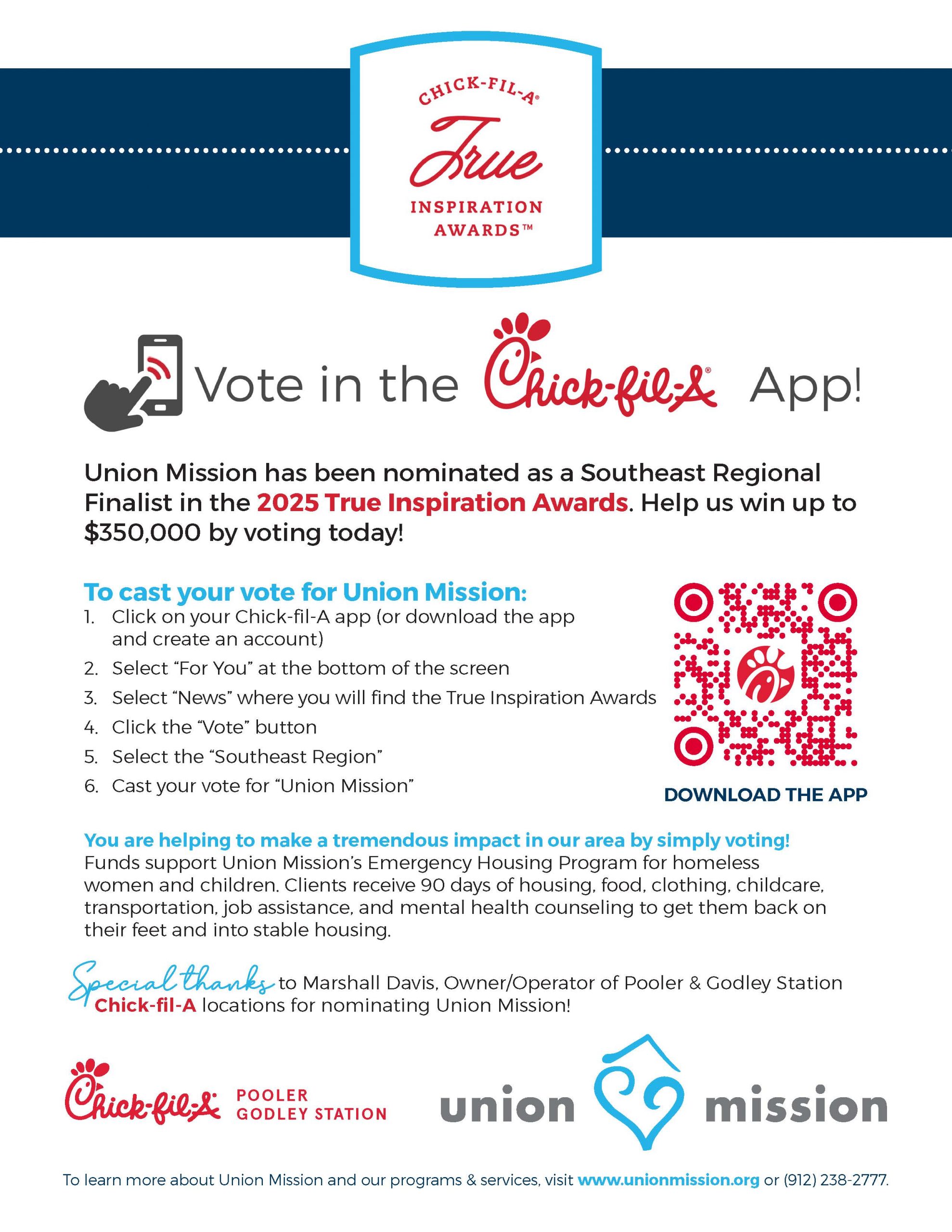 Thanks to Marshall Davis, Owner/Operator of Pooler & Godley Station Chick-fil-A locations, for nominating Union Mission! Click the image below and vote today.