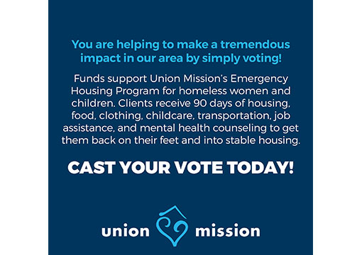 Funds support Union Mission’s Emergency Housing Program for homeless women and children. Clients receive 90 days of housing, food, clothing, childcare, transportation, job assistance, and mental health counseling to get them back on their feet and into stable housing.